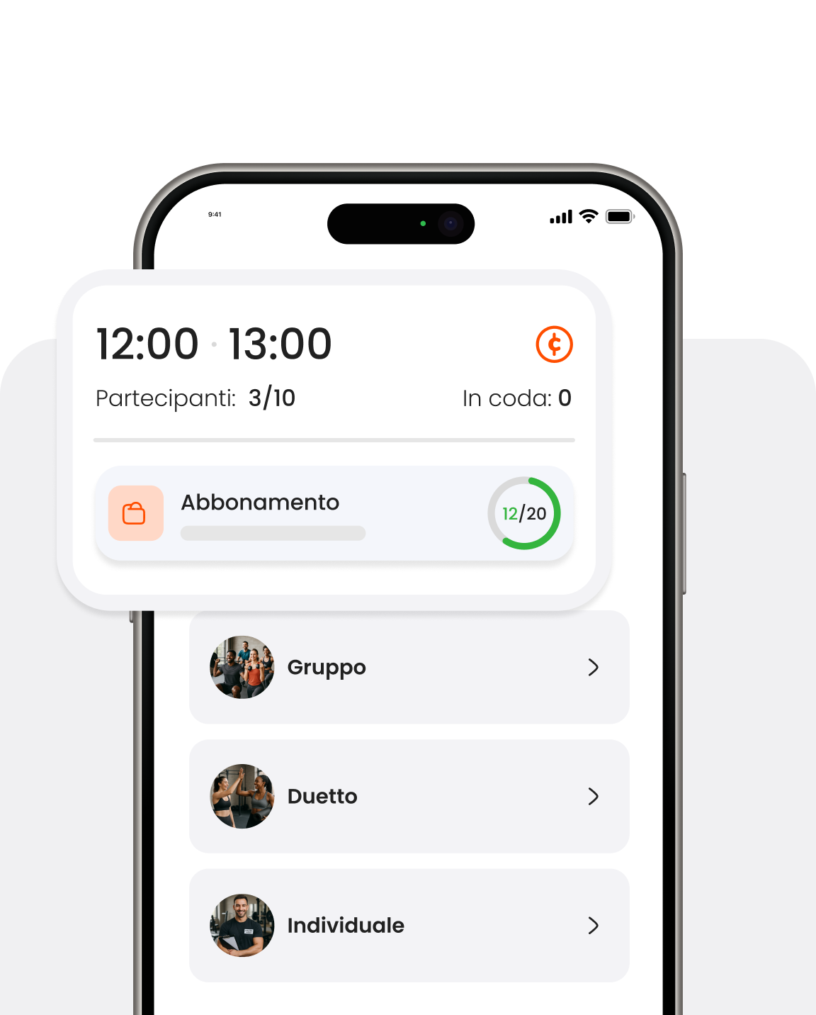 Small Group e Lezioni duetto Ottimizza le disponibilità di stanze, attrezzatura e staff inserendo o consentendo ai tuoi clienti di inserire in autonomia le preferenze per giorno e orario in cui partecipare a uno small group o una lezione duetto. Gli altri utenti potranno vedere le disponibilità e le preferenze degli altri e decidere se unirsi alle lezioni prenotandosi in autonomia.